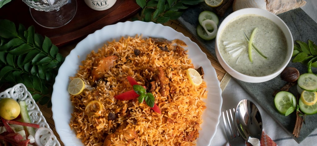 Sprinkle coriander, mint, fried onions, and saffron milk (if using).